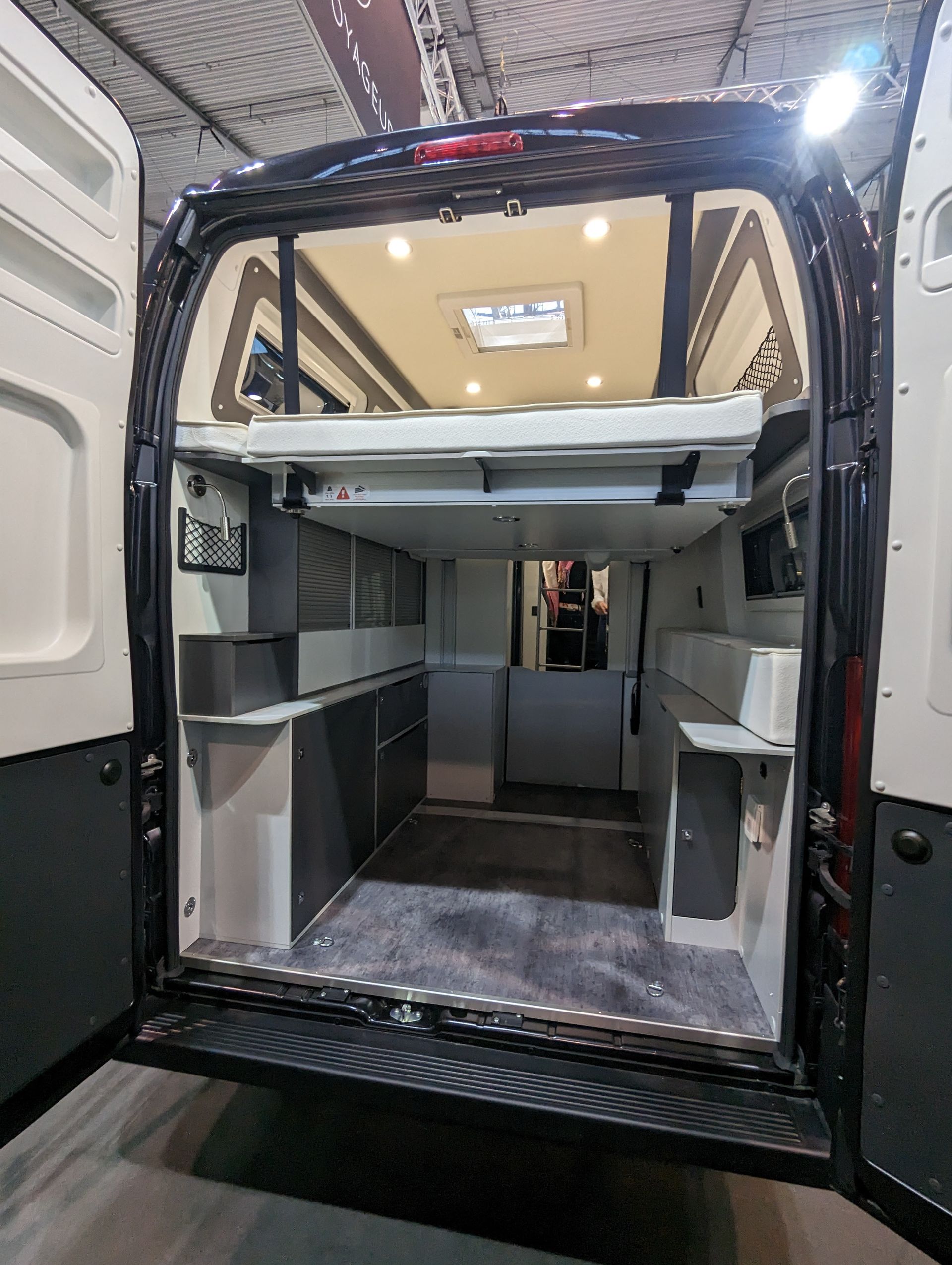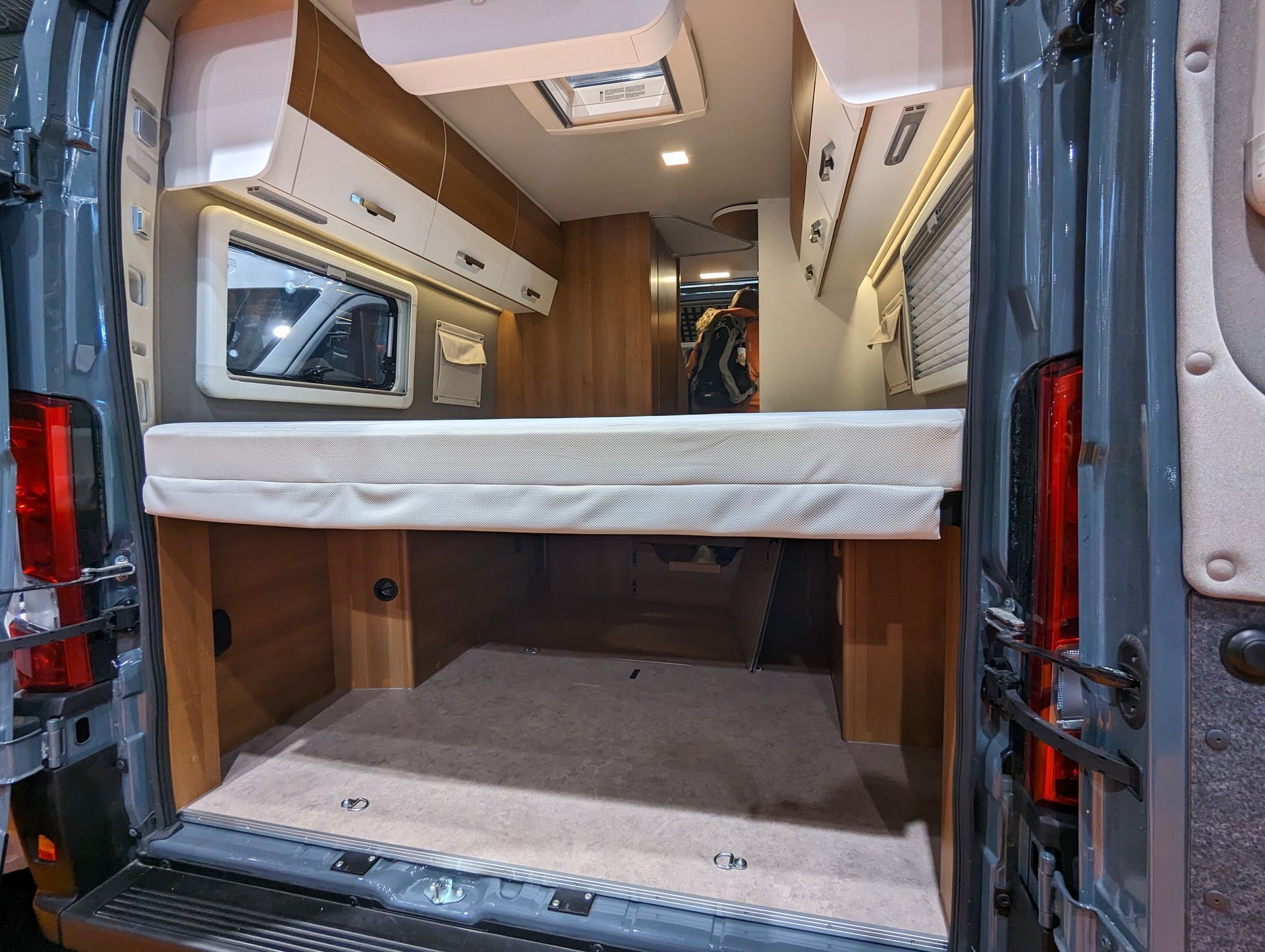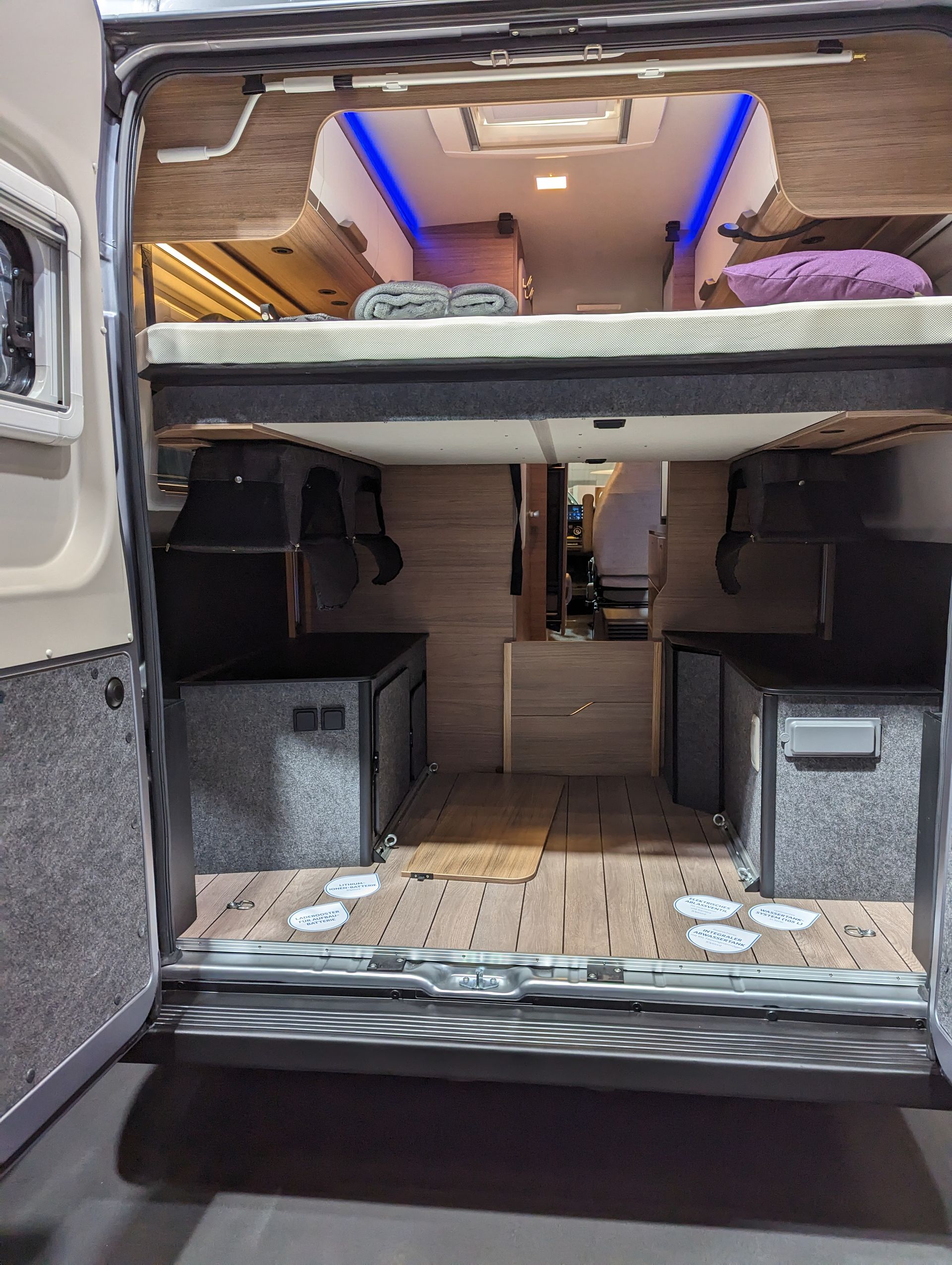 Das Fahrzeug ist wintertauglich, hat einen Doppelboden, das H3 Dach ist isoliert sowie die Seitenwände, hinten heraus ist der obere Teil zu, sodass hier eine Kältebrücke entsteht, wenn die Hecktüren geöffnet werden und es ist eine Diesel-E-Heizung verbaut. Somit könnten wir auch im Winter in dem Camper schlafen.